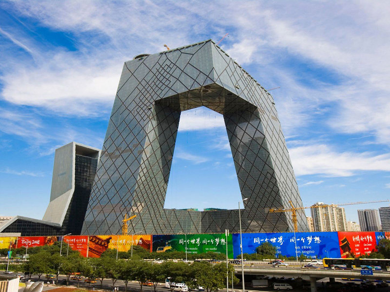 中央電視臺(tái)總部大樓(CCTV Headquarters),位于北京市朝陽(yáng)區(qū)東三環(huán)中路32號(hào),地處北京商務(wù)中心區(qū)(CBD),比鄰北京國(guó)貿(mào)大廈。園區(qū)共由三個(gè)建筑物組成:位于西南側(cè)的中央電視臺(tái)總部大樓(主樓)、位于西北側(cè)的電視文化中心(北配樓)以及位于東北角的能源服務(wù)中心 ?。 中央電視臺(tái)總部大樓占地面積18.7萬(wàn)平方米,總建筑面積約55萬(wàn)平方米,其中主樓為兩棟分別為52層234米高和44層194米高的塔樓組成,設(shè)10層裙樓,并由在162米高空大跨度外伸,高14層重1.8萬(wàn)噸的鋼結(jié)構(gòu)大懸臂相交對(duì)接,總用鋼量達(dá)14萬(wàn)噸。北配樓高159米,主樓為30層,裙樓為5層。于2004年10月21日動(dòng)工建設(shè),2012年5月16日全部竣工交付使用 。