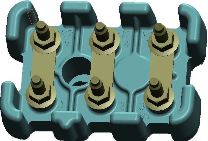 連接導(dǎo)線上不僅印有符合 IEC 60034-8 標準的標志,而且配 有指定的接線端子。W20 電機配備玻纖增強不飽和聚酯團狀 模塑料 (BMC) 接線柱,如下圖所示。
